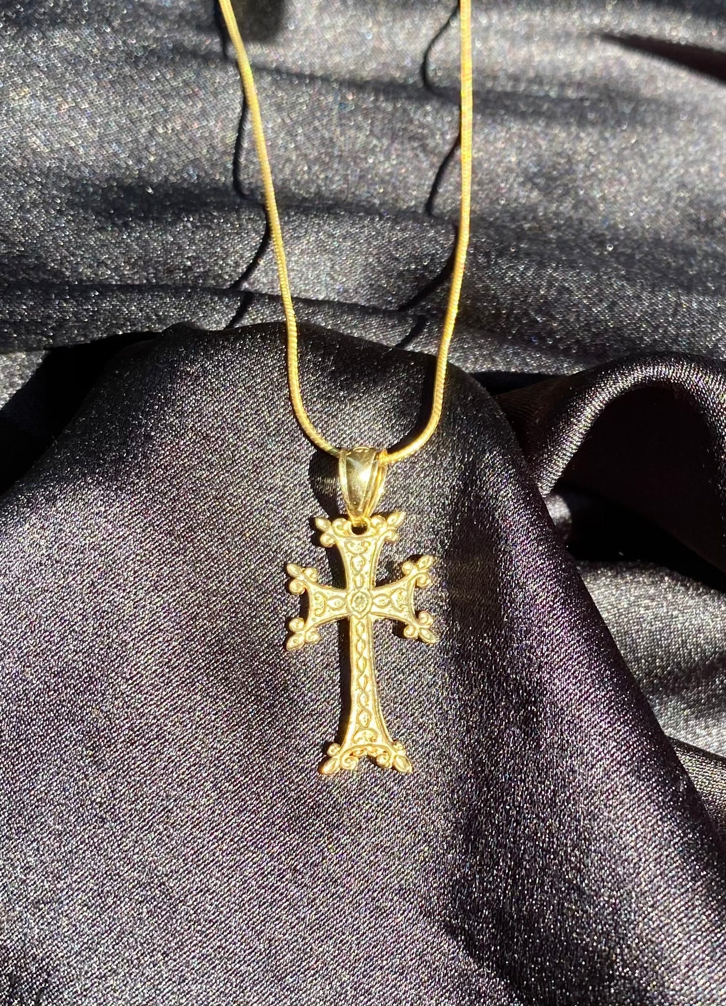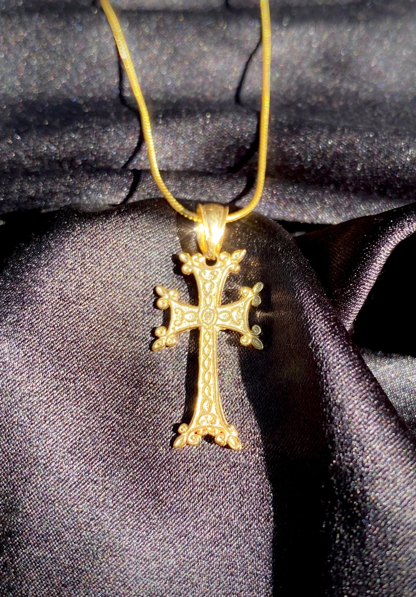 Armenian Cross pendant approx 1” long, 14k gold plated over Solid Sterling Silver. Chain is 14K Gold Vermeil over Solid Sterling silver and stamped 925 ITALY.