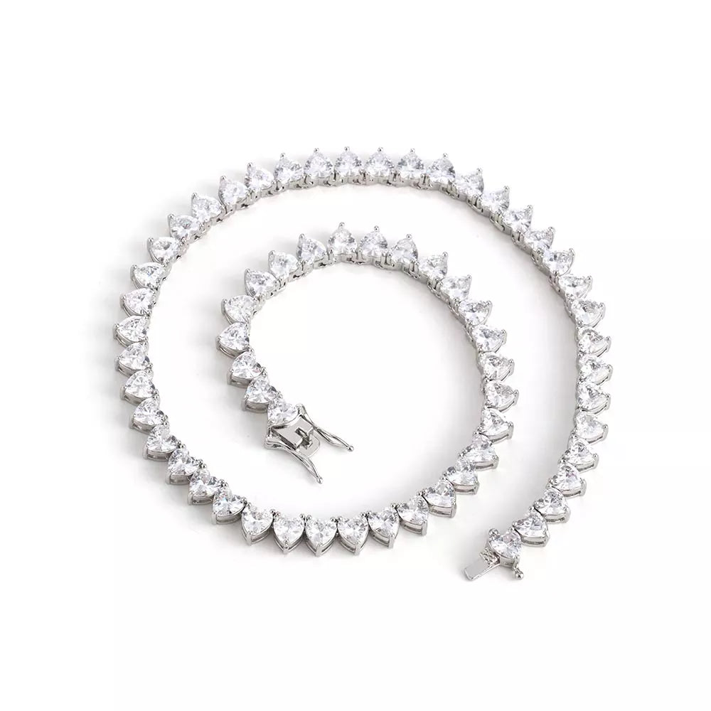 AAA Cubic Zirconia Gold Plated Heart-Cut Tennis Necklace. Necklace is secure with a box clasp, 16” long. Available in Gold, Silver, and Pink.