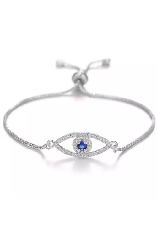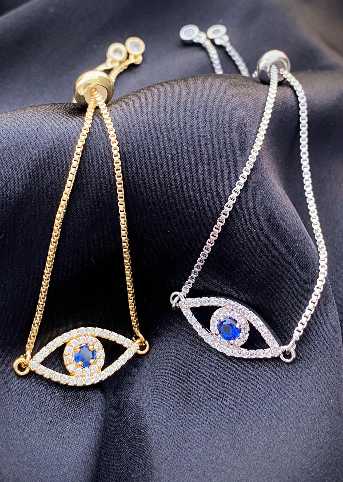 CZ Evil Eye Pull Tie Adjustable Bracelet, Available in Gold & Silver Stone: Cubic Zirconia Style: Adjustable Gold Plated