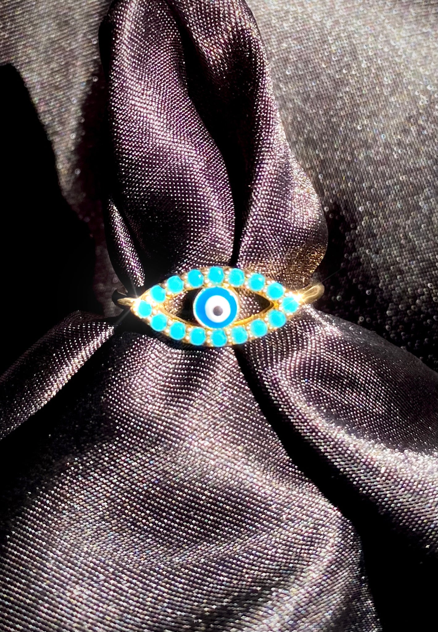 Dainty Gold Filled Turquoise Evil Eye Ring, Adjustable Open Size 8.