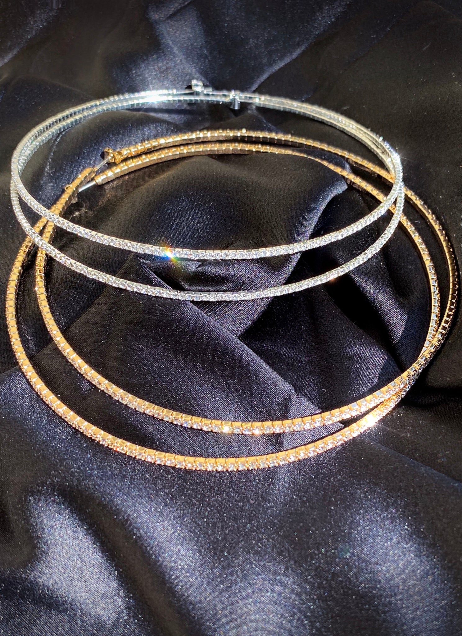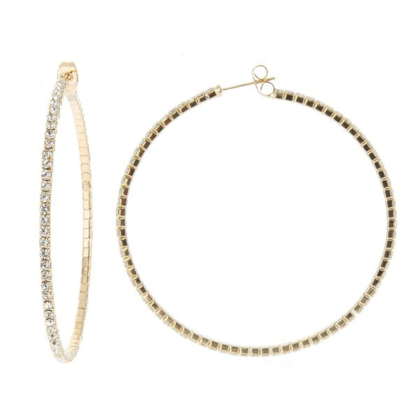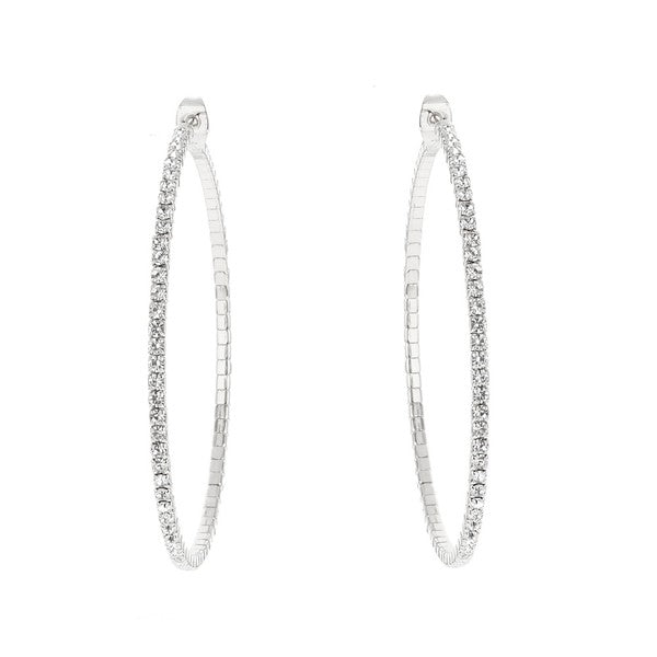 Delicate Rhinestone Hoop Earrings. Silver or Gold Plated (depending on color) with Baby CZ Stones. Size: 4" x 4" Available in Silver and Gold.